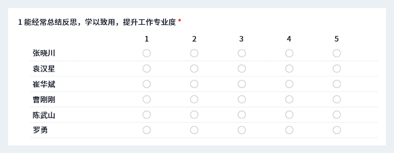 公司沒有相關(guān)的評估系統(tǒng),用問卷星360度評估很方便,既可以按照不同的層級占比進行不同的分數(shù)計算,也可以按照不同的題目類別進行分類匯總,相比人工統(tǒng)計非常省時。技術(shù)支持也很nice,響應(yīng)很迅速,好評!